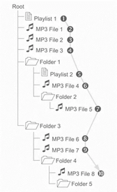 - Mappen en muziekbestanden worden weergegeven in volgorde van Symbool → Nummer → Taal